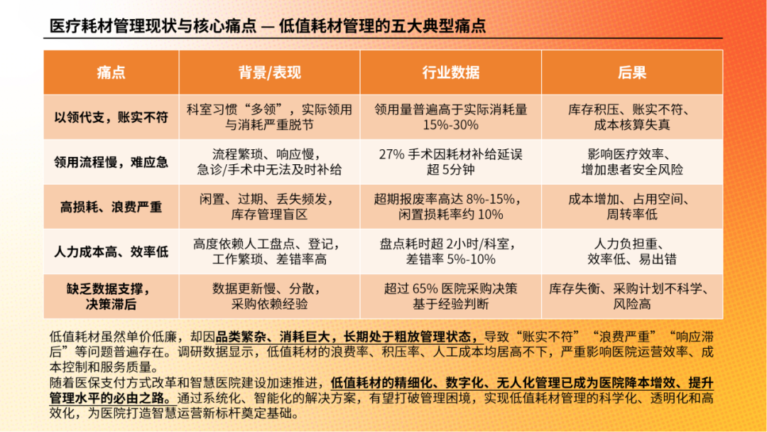 在这本白皮书里,我们梳理了当前医疗行业低值耗材管理的五大典型痛点: