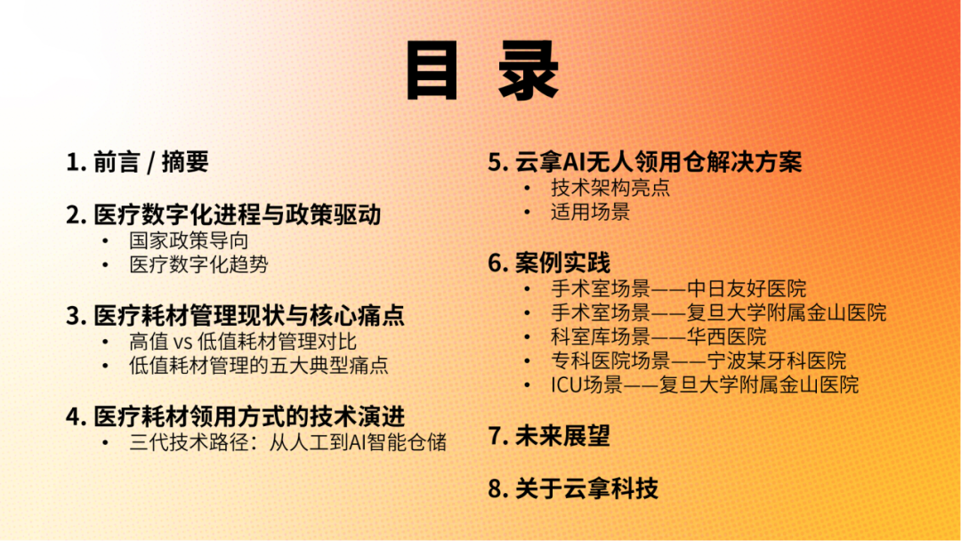 作为深耕医疗行业数字化的先行者,云拿科技正式发布 《医疗耗材数字化领用白皮书:以低值耗材为切入口的AI智能仓储实践》。