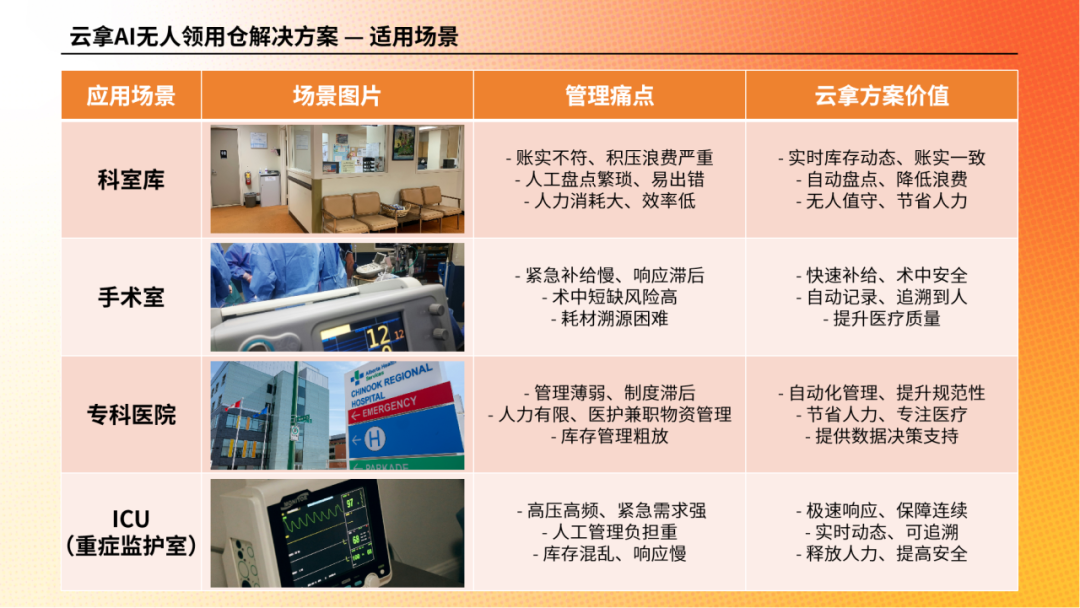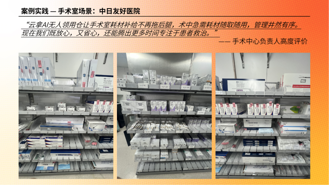 这些案例证明,通过云拿AI无人领用仓解决方案,医院不仅实现了账实一致、损耗降低、盘点效率大幅提升,还显著释放了医护人力,让大家能更专注于患者服务。