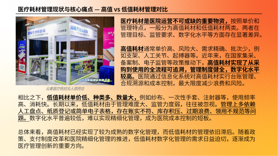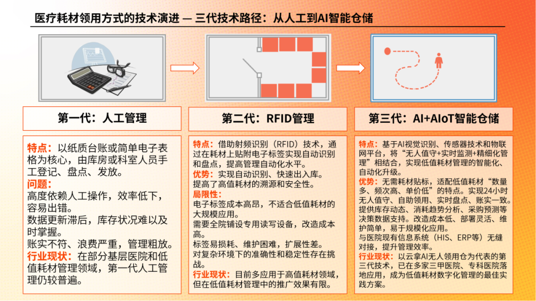 并首次完整呈现低值耗材管理“三代技术演进路径”——从人工到RFID再到AI+AIoT智能仓储,用真实数据和案例验证智能化无人领用仓的价值。