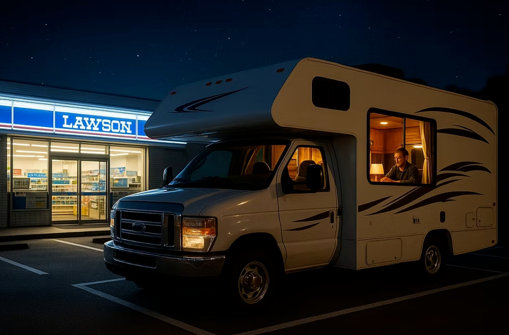 在日本千叶的海边,一些罗森门店的停车场有了新功能。夜幕降临,车灯驶入、窗帘拉起,这里成了自驾旅人短暂的栖身之所。便利店不再只是补给点,而是旅途的能量站、夜晚的安全屋、移动生活的港口。